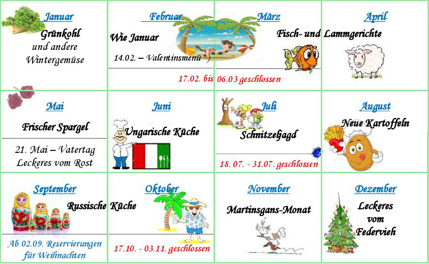 Neben unserer umfangreichen Speisekarte überraschen wir unsere Gäste jeden Monat mit einer besonderen Angebotskarte kulinarischer Spezialitäten: